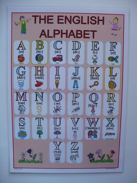 Přehledná tabule s kompletní anglickou abecedou napomáhá snadnějšímu osvojení čtení jednotlivých písmen