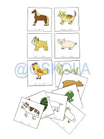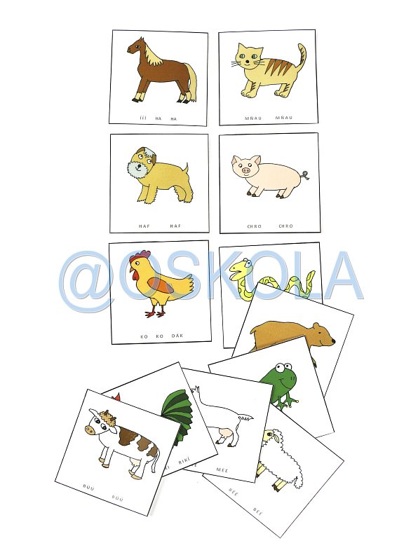 Na kartičkách jsou obrázky zvířátek a pod obrázky jsou napsané citoslovce zvuků, které zvířátka vydávají.