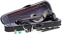 4/4 elektrické housle. Sada obsahuje elektrické housle (tělo masivní javor, zabudovaný předzesilovač pro sluchátka, aktivní snímač s 2-pásmovým ekvalizérem), smyčec a kalafunu, sluchátka a 9V baterii, vše v pevném pouzdře. Barva černá.