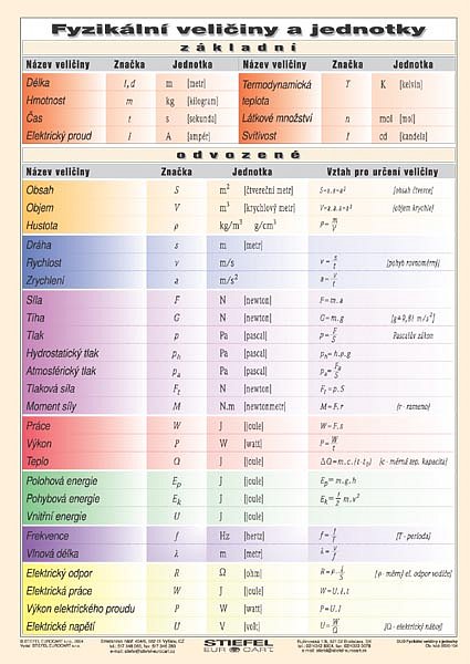 Modrý program » Fyzika » Fyzikální veličiny a jednotky. Obsahem didaktické pomůcky je ve velmi přehledné formě zpracována tabulka fyzikálních veličin a jednotek. Rozdělené fyzikální veličiny na základní a odvozené jsou dále charakterizovány značkou, jednotkou a vztahem pro jejich určení. V přehledné a pěkně barevně řešené tabulce jsou uvedeny informace základní ve shodě s didaktickými potřebami pro základní školy, ale i informace rozšiřující tyto základní vědomosti. Nástěnná naučná tabule je určena k výuce v 6. až 9. ročníku ZŠ a k výuce a opakování na středních školách včetně gymnázií. Je vhodná k trvalému vyvěšení nejen v odborných učebnách. Zadní strana je pracovní, bez popisu. Formát: 100 x 140 cm