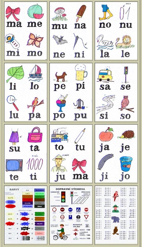 | ma-me-mi-mo; mu-na-ne-ni; no-nu-la-le; li-lo-lu-pa; pe-pi-po-pu; ja-je-ji-jo; sa-se-si-so; su-ta-te-ti; to-tu-ju; malá násobilka bez výsledků; barvy- míchání barev; dopravní značky ,světelná signalisace-značení,cyklo. | |