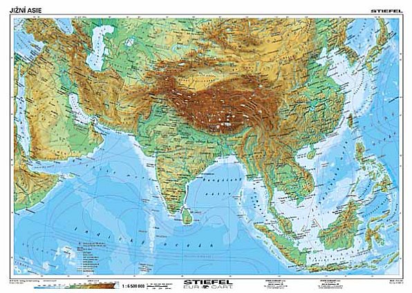 Modrý program » Zeměpis » Kontinenty » Jižní Asie obecně geografická + Jižní Asie politická. Mapy kontinentů a světadílů s českým popisem jsou oboustranné, kdy na jedné straně je mapa obecně geografická a na straně druhé mapa politická. Při přepisu do českého jazyka je použita transliterace, transkripce a jsou použity i vžité české názvy - exonyma. Obecně geografické mapy mají shodné barevné znázornění terénu, kdy zvolená barevná škála je estetická, vyvážená, zprostředkovává členitý obraz povrchu a výrazné reliéfní znázornění výškových poměrů. Prostorový dojem zvyšuje použité plasticky působící stínování. Znázornění hlavních složek polohopisu je na všech mapách shodné. Použití mapy v hodinách zeměpisu usnadňuje popis a zapamatování zeměpisné polohy, rozlohy, členitosti pobřeží, povrchu, charakteru a rozmístění vodstva světadílů a kontinentů. Politické mapy mají shodné znázornění hlavních složek polohopisu a zřetelnou barevnost jednotlivých států, kdy volené odstíny barev jsou estetické a vyvážené. Mapa má sloužit především při výkladu učitele, ale i k snadnější a rychlejší orientaci žáků na mapách, usnadňuje charakterizování a zapamatování významných států, hlavních a nejvýznamnějších měst, významných oblastí koncentrace obyvatelstva, hospodářských oblastí. Hlavní využití map je v 6. a 7. ročníku ZŠ a na gymnáziích v hodinách regionálního zeměpisu. Formát: 160 x 120 cm Měřítko: 1 : 6,5 mil.