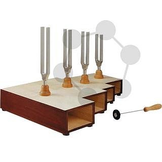 4 ladičky na rezonanční skříňce s kladívkem: c1 = 256 Hz, e1 = 320 Hz, g1 = 384 Hz, c2 = 512 Hz