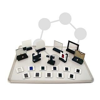 Diodový laser s držákem, 2 zrcadla, 2 seříditelné držáky pro zrcadla, 1 polopropustné zrcadlo, 1 polarizační filtr, 1 matnice, prvky pro interferenční a refrakční struktury, 1 hologram, se síťovým adaptérem a kovovou tabulí, v plastovém kufru. S návodem k obsluze v AJ.