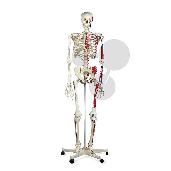 Jako standardní lidská kostra, avšak na jedné straně jsou navíc barevně vyznačeny svalové úpony (modře) a začátky (červeně). Samostatně jsou různými barvami znázorněny M. iliocostalis a M. longissimus. Druhá strana kostry je opatřena více než 300 čísly, která označují nejdůležitější kosti, části kostí, rýhy a otvory.