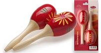 Pár dřevěných maracas v červeném květinovém vzoru. Délka 16 cm, rukojeť z topolu, březová chrastidla.