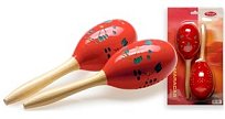 Pár dřevěných maracas, délka 28 cm. Rukojeť z topolu, březová chrastidla. Červený květinový design.