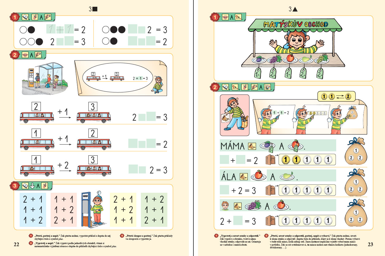 Připravili jsme pro vás 1, díl nové pracovní učebnice matematiky pro 1, ročník, ve které provází žáky hodný skřítek Matýsek, Učebnice jsou koncipovány tak, aby žák nebyl nucen pochopit látku vždy v přesný okamžik, ale dávají naopak prostor k postupnému pochopení látky každým žákem dle jeho možností, Nová učebnice matematiky mimo jiné aplikuje čtení jako prostředek k získávání matematických dovedností, K tomu využívá zejména obrázkové čtení, Žáci "čtou" pokyny k úkolům zpočátku pomocí jednoduchých piktogramů, které se samozřejmě postupně proměňují v pokyny slovní, Tento přístup napomáhá k rozvoji samostatnosti žáků a díky tomu zvyšuje jejich učební sebevědomí, Učebnice je bohatě mezipředmětově propojena především s prvoukou, Postupně jsou řazena témata: cesta do školy, ve škole, na podzim sklízíme ovoce a zeleninu, obchod a nakupování, les a podzim, K učebnici připravujeme i multimediální interaktivní učebnici (MIUč+),