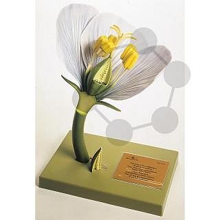 Zvětšeno cca 10×. Model ukazuje květ v mediánním podélném řezu s odnímatelnými jednotlivými částmi. Díky tomu je v příčném a podélném řezu viditelná poloha semeníků. Jedna polovina prašníku je otevřená, takže je vidět pyl.