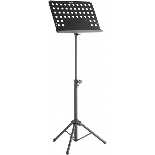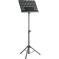 Koncertní notový stojan, robustní dvoudílná kovová trubková konstrukce s nylonovými spojovacími částmi, pevná děrovaná deska, rozměry desky (š x v x h) 47,5 x 34,5 x 5,5 cm, nastavitelná výška 70 - 110 cm, hmotnost 2,9 kg. Barva černá.