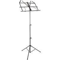Notový skládací stojan s nylonovým pouzdrem, třídílná kovová trubková konstrukce s nylonovými spojovacími částmi, pružinové držáky stránek, nastavitelná výška 48 - 114 cm, průměr trubek 10 mm, 13 mm, 16 mm, hmotnost 0,89 kg. Barva černá.