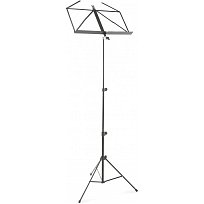 Notový skládací stojan s nylonovým pouzdrem, třídílná kovová konstrukce s nylonovými spojovacími částmi, pružinové držáky stránek, nastavitelná výška 51 - 117 cm, průměr trubek 8 mm, 12 mm, 16 mm, hmotnost 1,06 kg. Barva černá.