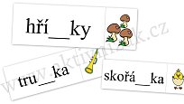 Pomůcka slouží dětem k doplňování párových souhlásek uprostřed slov. Každá karta obsahuje napsané slovo bez prostředního písmena a namalovaný obrázek příslušného slova.