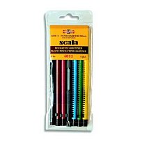 Pastelky z plastické hmoty s mechanickým vysouváním výměnné tuhy. Souprava obsahuje hrotítko.