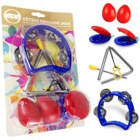 Dětská sada oblíbených perkusních nástrojů. Sada obsahuje malou tamburínu s plíšky, pár chrastících plastových vajíček, malé plastové kastaněty a triangl s paličkou. Nástroje jsou provedeny v pestrých a veselých barvách. Tyto perkusní nástroje rozvíjí hudební dovednosti a motorické schopnosti dětí. Pro děti od 3 let.