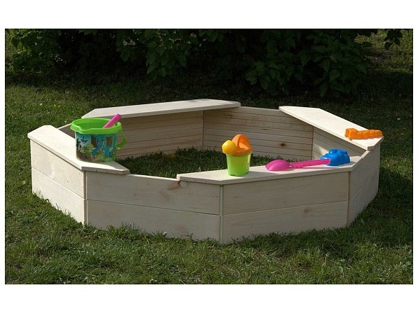 Dřevěné pískoviště osmihranné se čtyřmi sedáky.