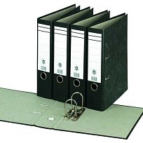 Kartonový pákový pořadač, potah mramorovaný papír. Otvor pro snadné vytažení, hřbetní štítek. Kovová páková mechanika, rado kroužky.