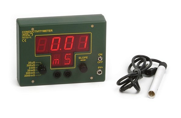 Demonstrační měřící přístroj na měření elektrické vodivosti kapalin. Přístroj je magneticky upínatelný.