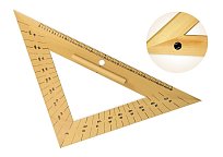 Trojúhelník dřevěný 45* s úhloměrem, opatřený na zadní straně u jednotlivých vrcholů protiskluznými kroužky.
