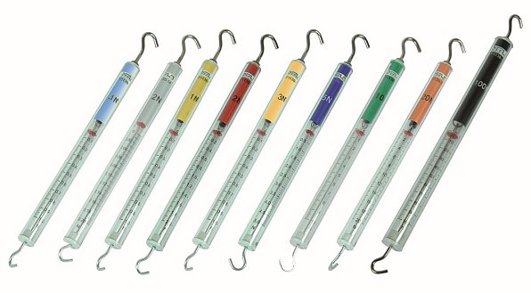 Pružinový siloměr se stupnicí v Newtonech a korekturou nulového bodu pomocí nastavovacího šroubu. |