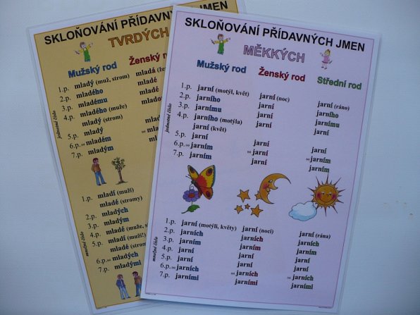 Dvě nástěnné tabule o velikosti A1 s přehledným skloňováním přídavných jmen měkkých a tvrdých a doplněno vhodnou ilustrací