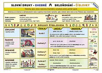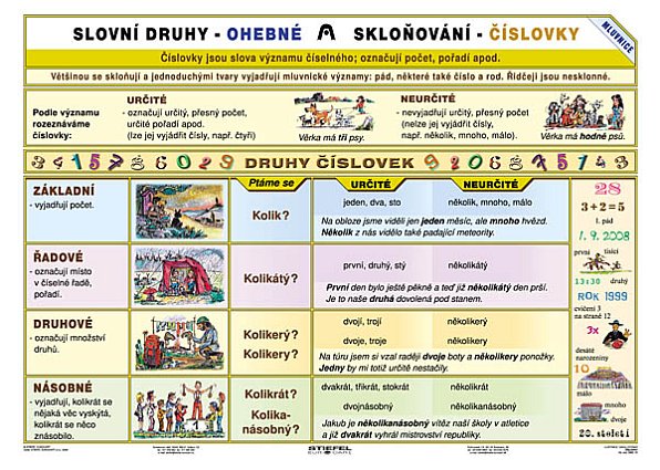 Naučná tabule ČÍSLOVKY rozšiřuje naši nabídku naučných tabulí o slovní druhy a byla vytvořená podle stejných zásad. Přehledné, barevné zpracování tabulky druhů číslovek, které obsahuje nejen vyjmenování číslovek, ale i vzorové věty a vhodné ilustrace, napomáhá žákům snadněji si osvojit určování u číslovek jejich druh. Zadní strana je věnovaná skloňování základních číslovek a pravidlům psaní číslovek v textu. Formát: 140 x 100 cm