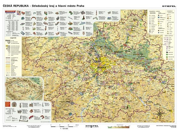 Modrý program » Zeměpis » Česká Republika » Česká republika – Středočeský region a Praha. První dvě mapy z připravovaného souboru regionálních vlastivědných map české republiky začínají severozápadním a středočeským regionem. Podkladem pro vlastivědné informace je obecně geografická mapa se zakreslením všech obcí a dopravní sítě. Z vlastivědných údajů, které se v mapách nachází, vybíráme: městská památková rezervace, muzeum, přírodní zajímavost, průmysl a zemědělství… Součástí map je i malá mapa české republiky, která má žákům napomáhat vyjádřit polohu zobrazeného regionu k ostatním vyšším územním a správním celkům ČR a dále legendy se základní charakteristikou kraje, s vykreslenými významnými historickými, technickými, stavebními a uměleckými památkami daného kraje. Mapa středočeského regionu obsahuje na zadní straně slepou verzi mapy středočeského regionu a Prahy k pracovnímu využití. Regionální vlastivědná mapa je určena pro 3., 4. a 5. ročník ZŠ a má napomáhat podrobnějšímu poznávání místní krajiny i významných hospodářských, rekreačních, uměleckých, kulturních a chráněných středisek. Formát: 160 x 120 cm Měrítko: 1:125 tis.