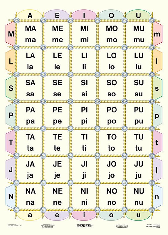Didaktická pomůcka je určena pro 1. ročník k hlasitému nácviku čtení slabik a také k aktívní práci v hravé podobě. Přední stranu pomůcky tvoří barevná tabulku se slabikami vytvořenými kombinací šesti samohlásek a sedmi souhlásek, které se prvňáci učí v průběhu prvního pololetí školního roku. Tabulka v sobě ukrývá i množství slov, která se dají ze slabik a písmen poskládat. Některá slova je možné najít hravě, některá slova naleznou ti šikovnější. Zadní strana obsahuje jednoduchá slova k procvičování čtení. Tato slova mají být pro žáky také podkladem k tvoření vět. Didaktická pomůcka je vhodná k trvalému vyvěšení. Formát: 100 x 140 cm