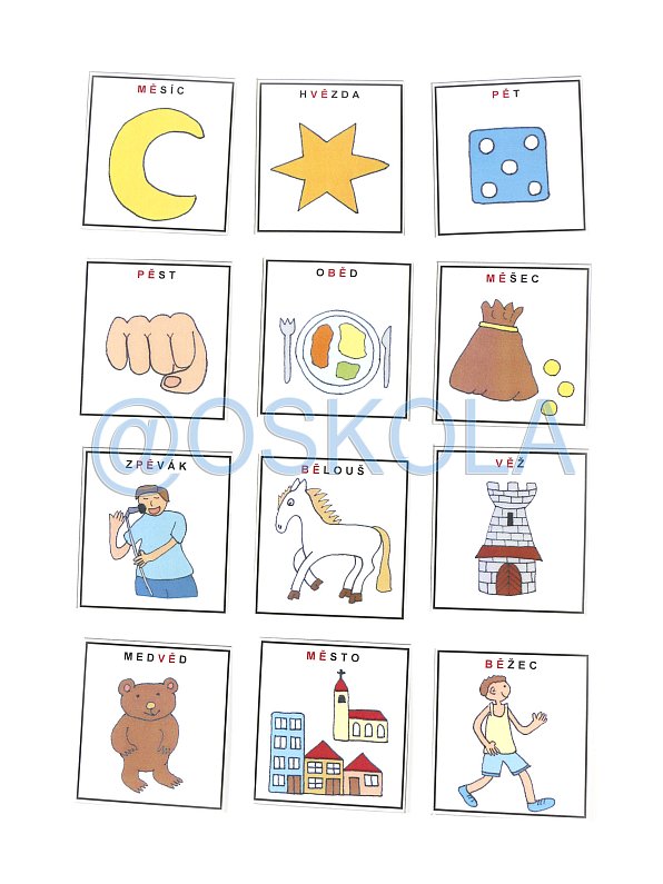Sada logopedických kartiček k procvičování výslovnosti.Tato sada procvičuje hlásky BĚ PĚ VĚ MĚ a obsahuje 24 kartiček se zvýrazněnou hláskou.