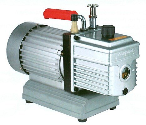 Dvoustupňová vývěva určená pro pokusy s vakuem pro nádoby větší než pět litrů.