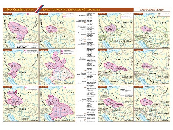 Ke stoletému výročí od vzniku Republiky Československé jsme připravili originální příruční mapu. Lícová strana na 12 mapkách zobrazuje postupný vývoj státních útvarů na našem území, od období Velké Moravy, přes Český stát za Přemyslovců a Lucemburků, Habsburskou monarchii, První republiku až po současné Česko. Mapy jsou navíc doplněny přehlednou časovou osou s výčtem všech panovníků prezidentů. Rubová strana mapy pak zobrazuje současné Česko se všemi významnými řekami, pohořími, nížinami a vrcholy, ale taky se základní sítí silnic a železnic, hranicemi krajů a velkými i menšími městy a obcemi.