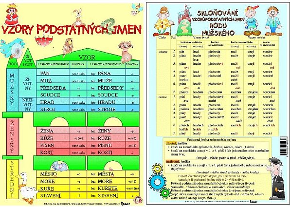 Přehled vzorů podstatných jmen v tabulce s pomůckou k určování.