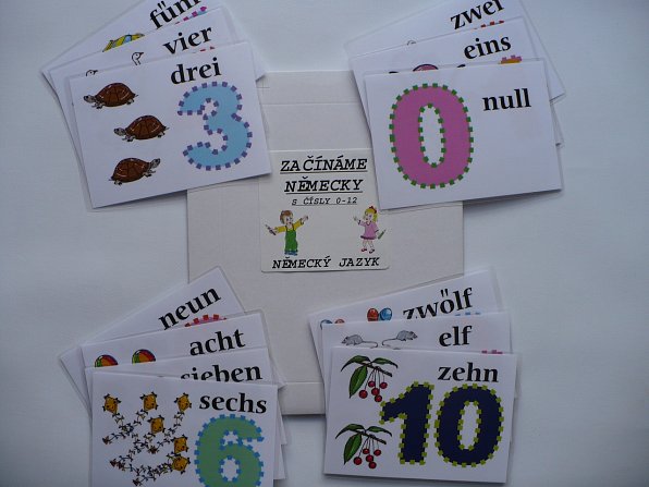 soubor tvoří 13 laminovaných ilustrovaných kartiček s čísly 0-12 s pojmenováním číslic v německém jazyce - využití: magnetická tabule, nástěnky - velikost: 154x111mm