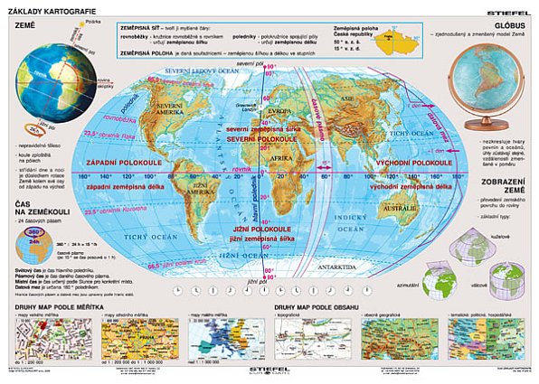 Modrý program » Zeměpis » Svět » Základy kartografie. Obsahem naučné tabule je tematický celek vzdělávacího programu pro vzdělávací předmět zeměpis v 6. ročníku – MAPA A GLÓBUS. Přední stranu didaktické pomůcky tvoří názorné ukázky zobrazení skutečnosti na mapu, učivo o určovaní zeměpisných stran, o měřítku mapy, znázorňování výškopisu a polohopisu na mapách. Na zadní straně, na mapě světa, je názorná ukázka pojmů: zeměpisná síť, poledníky, rovnoběžky, rovník, obratníky….. zemské polokoule, datová mez… K využití slouží i informace o Zemi jako vesmírném tělese, časových pásmech na Zemi, převedení zemského povrchu do roviny, druhy map podle měřítka a podle obsahu. Formát: 160 x 120 cm