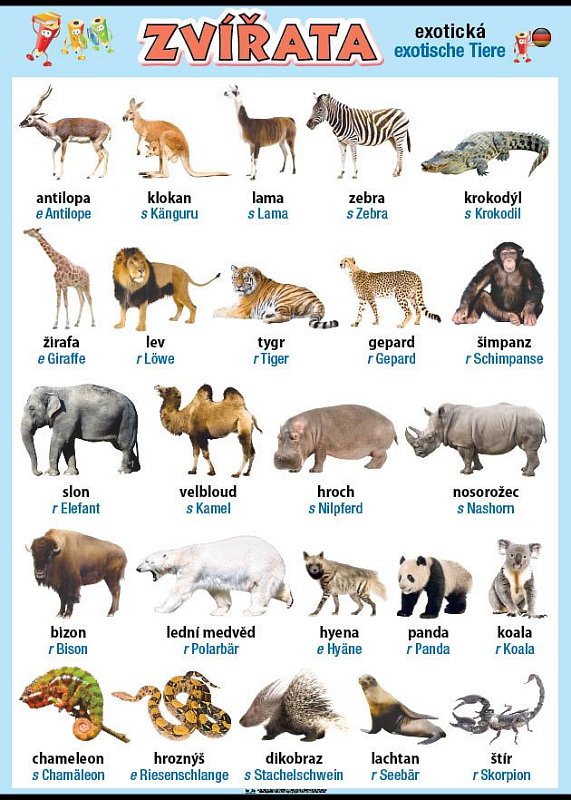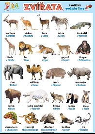 Nástěnný obraz pro výuku německých slovíček na téma exotická zvířata (exotische Tiere)